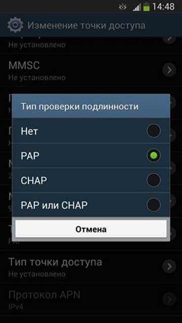 В следующем окне прокрутите вниз и выберите два элемента: Authentication Type или Тип аутентификации и Access Point Type или Тип APN.