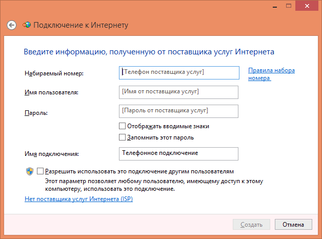 * В окне настройки нового подключения В соответствующих окнах введите номер вызова (*99# или*99 *** # , необходимо уточнить оператора мобильной связи) и название соединения (любое). Имя пользователя и пароль обычно указывать не нужно (оставьте пустыми);