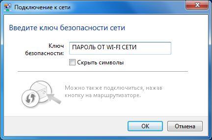 - Если сигнал Wi-Fi зашифрован с установленным кодом доступа, появится окно с полем, в которое его нужно ввести, а затем нажать «OK»;