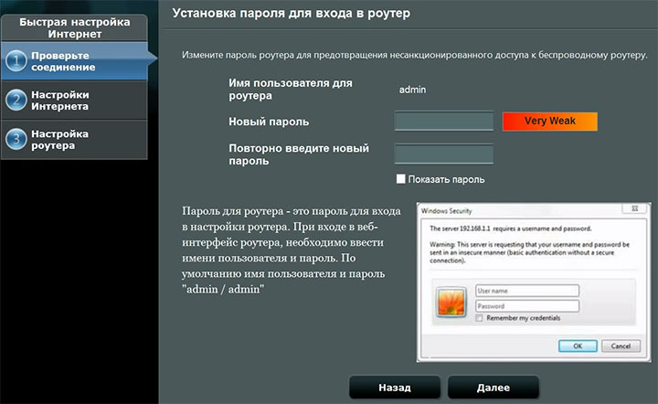 На следующей странице вам будет предложено задать новый пароль для входа в систему. в настройки Asus RT — N10P- Установите свой пароль и запомните его на будущее. Обратите внимание, что это не тот же пароль, который потребуется для подключения к Wi-Fi. onNext.