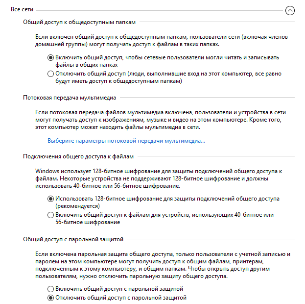 Затем выберите подраздел «Все сети» и отметьте опцию отключения общего доступа с защитой паролем с помощью радиокнопки внизу.