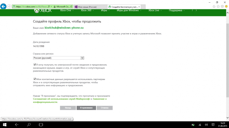 Шаг 4.3. Далее открывается страница авторизации, где необходимо ввести данные родителей. Если вы все сделали правильно, в нашем случае отображается страница, на которой указан аккаунт родителя с некоторыми данными dima_kiselchuk@live. com . они должны нажать & quot; Я принимаю& quot; и подтвердить, что вы прочитали и приняли соглашения Microsoft.